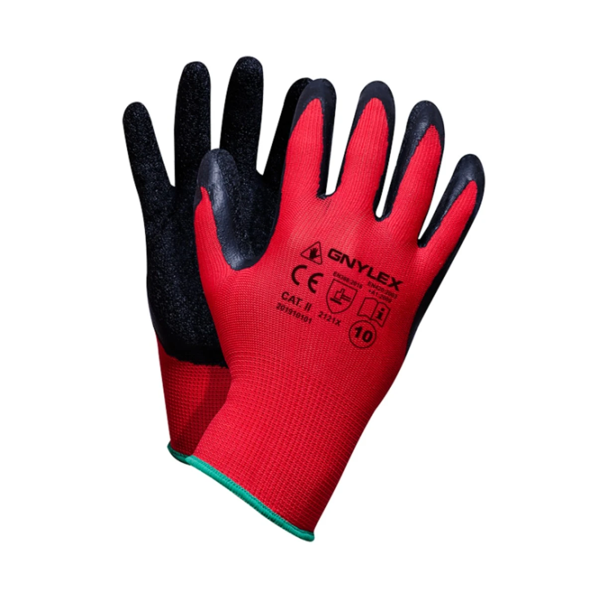 Aizsargcimdi, poliestera (13G) ar pamatni sarkanā krāsā, plauksta pārklāta ar krokotu lateksu melnā ...
